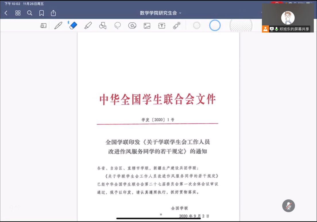 校研究生会的号召,全体成员学习了《关于推动高校学生会(研究生会)深化改革的若干意见》、《关于学联学生会工作人员改进作风服务同学的若干规定》等文件精神,并就日常工作可能遇到的问题与挑战作了具体分析研究。