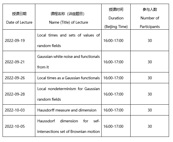 Abstract: This course aims to provide a solid introduction on some advanced numerical methods and its applications. The first part of the course will introduce the definition of local times and Gaussian functionals, then discuss some properties when local times as a Gaussian functionals. And the second part of the course is devoted to introduce Hausdorff measure and dimension, then use the Hausdorff measure and dimension to discuss sef-intersections set of Brownian motion. Professor Andrey will give students some time to understand the knowledge and give some small questions about the lecture.
